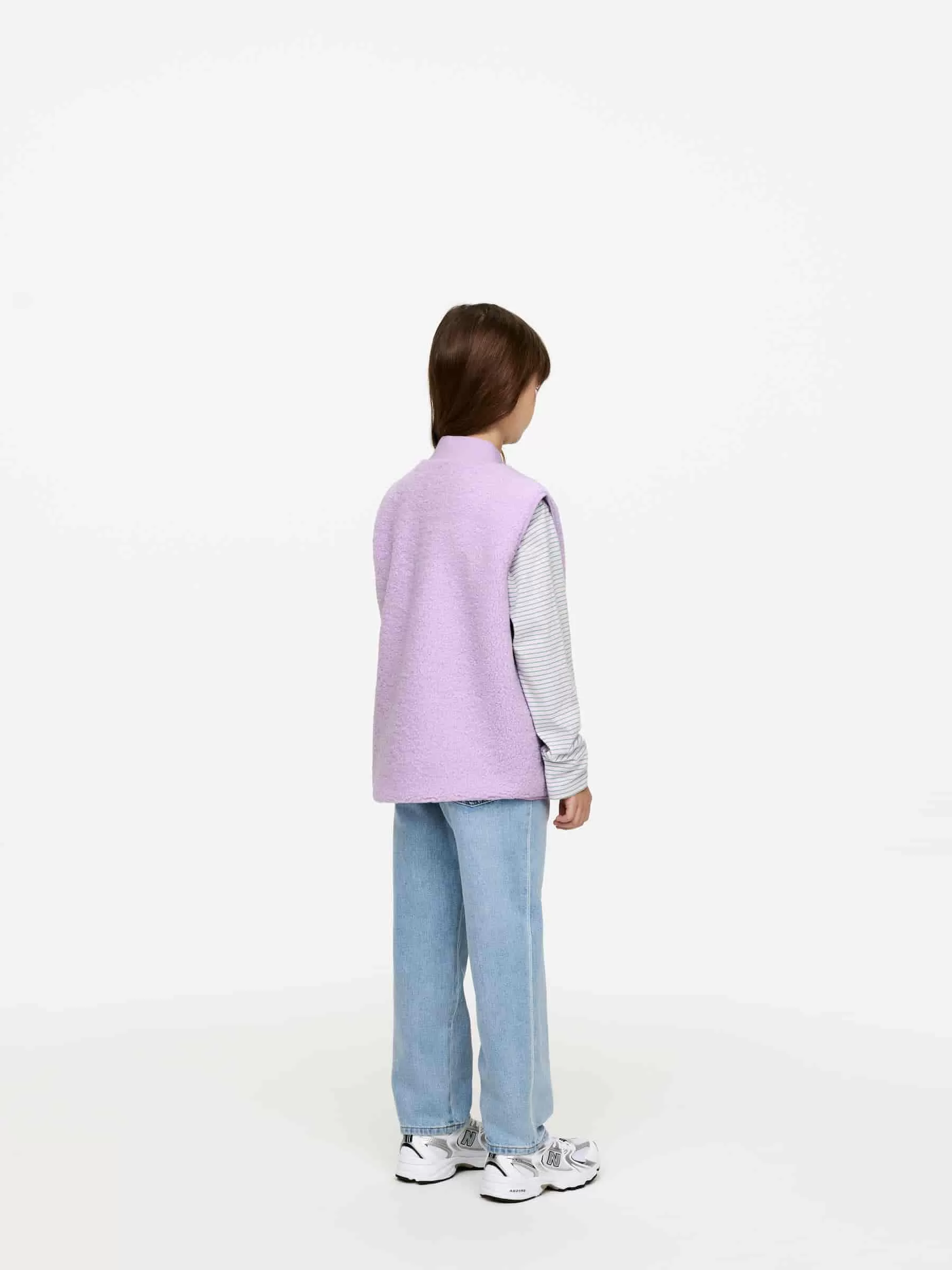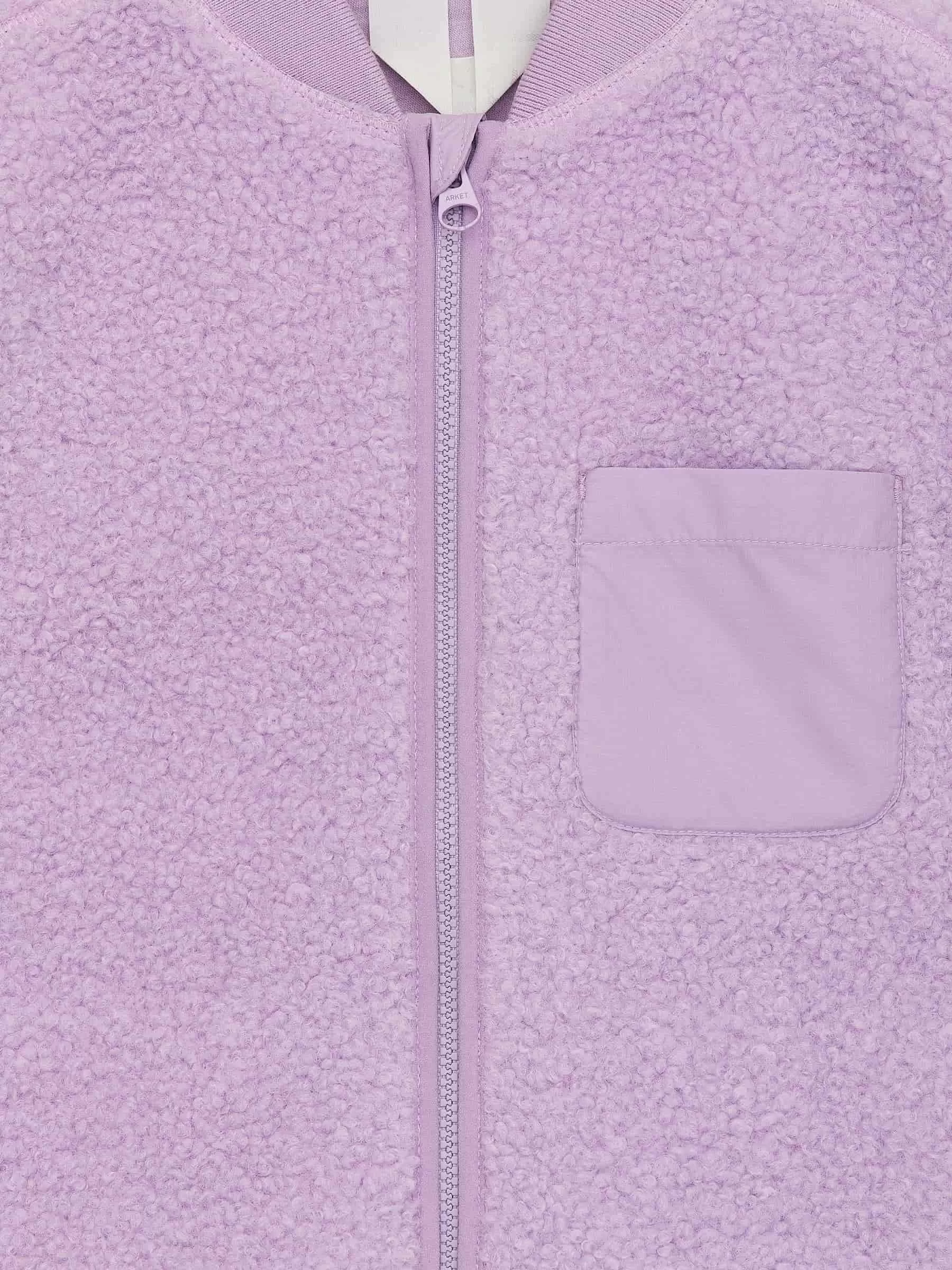 Weste aus weichem Florstoff. Aufgesetzte Signel-Tasche auf der Brust und Leistentaschen an den Seiten. Reißverschluss und Rippstrick am Hals.