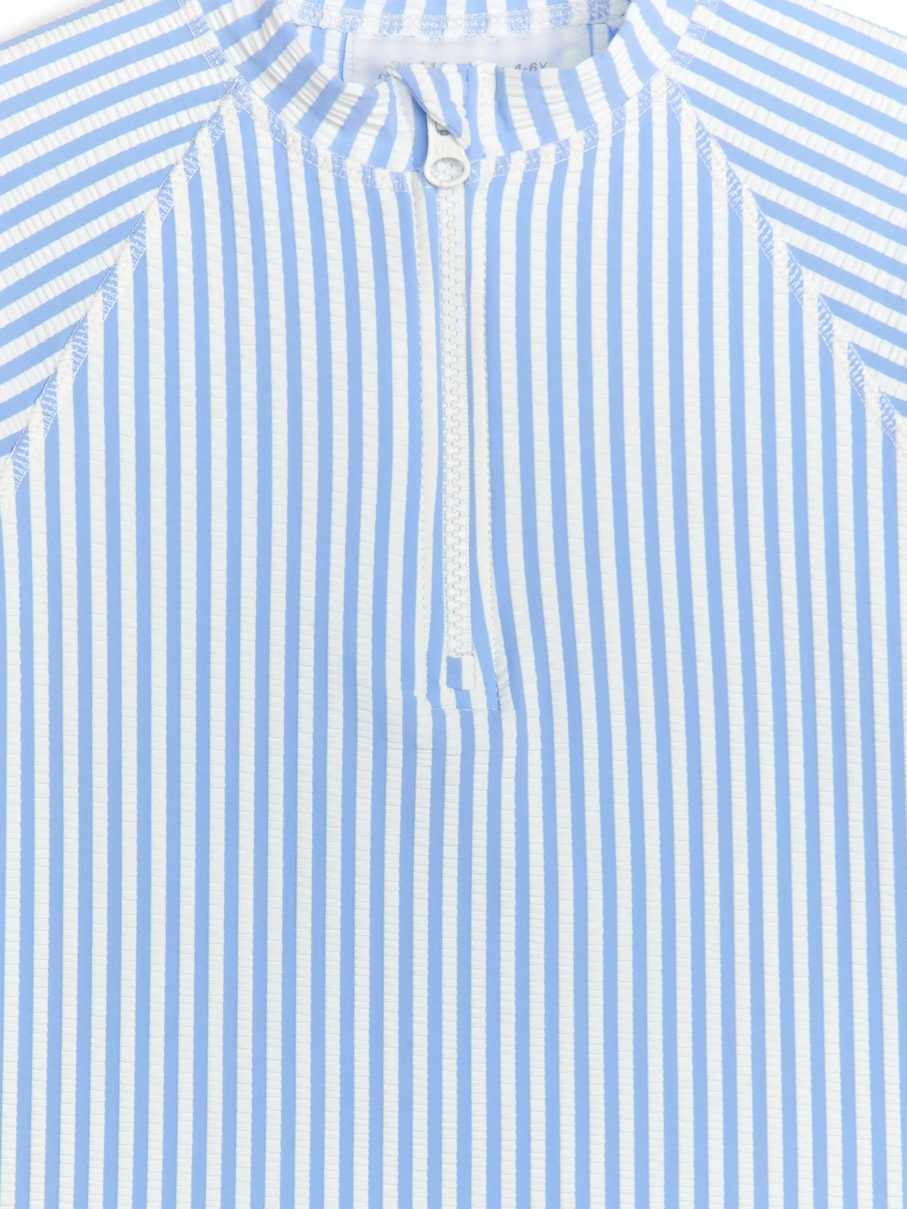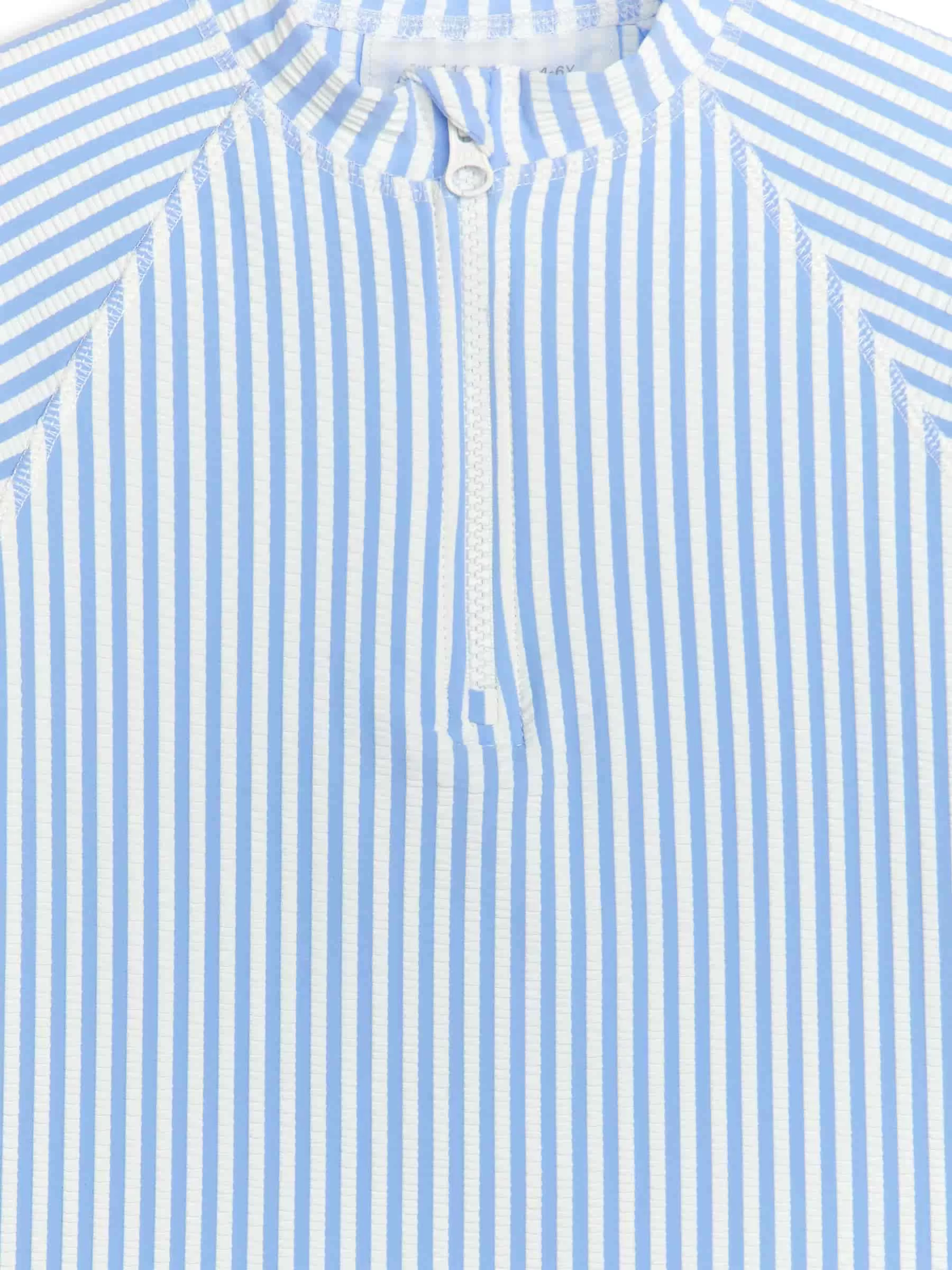 Langärmliges Badeoberteil mit UV-Schutztechnologie und Reißverschluss vorne. Das Material ist ein schnell trocknender Seersucker-Stoff.