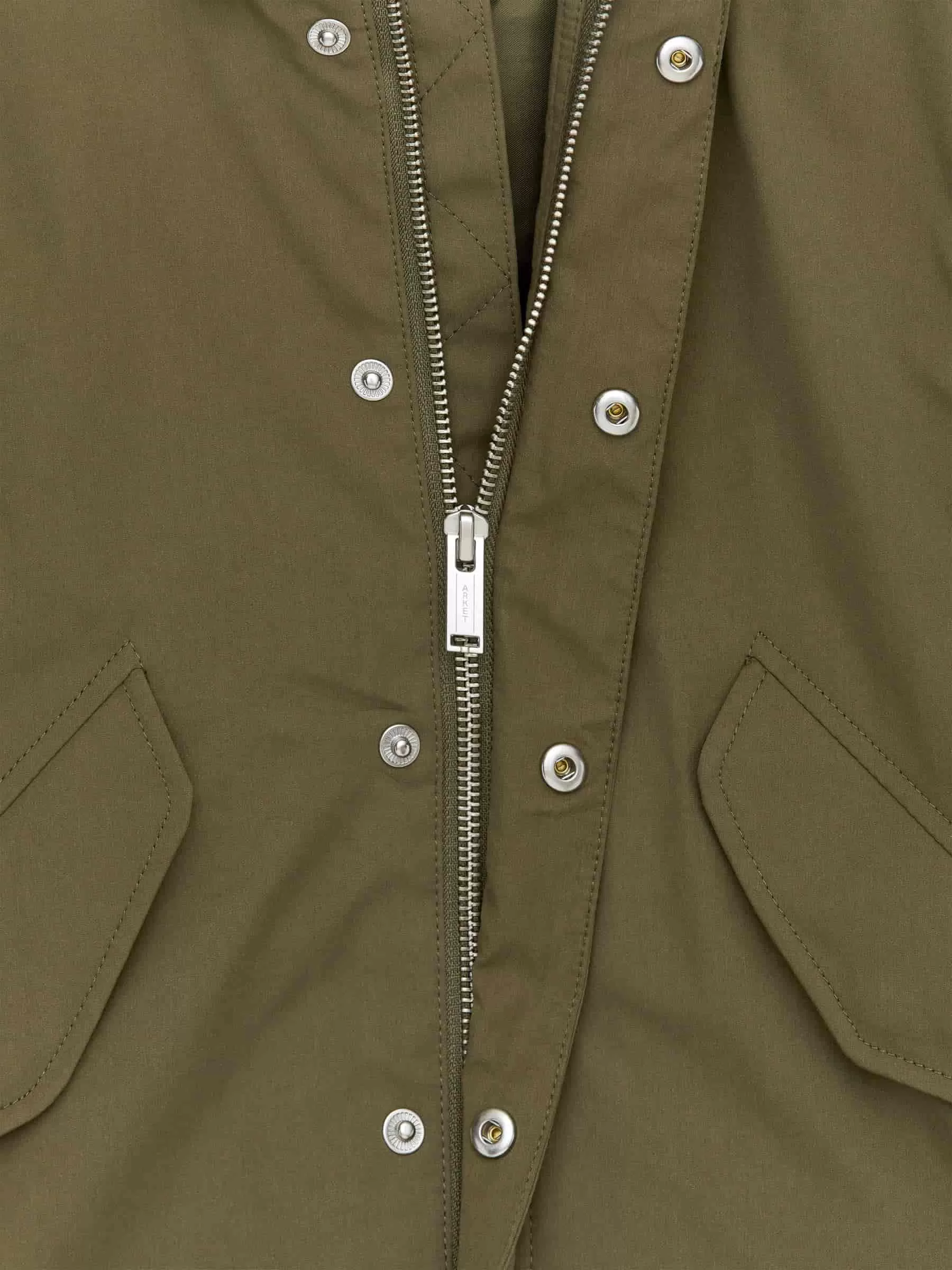 Parka mit Metallreißverschluss und versteckten Druckknöpfen. Leistentaschen mit Patte und verdeckten Druckknöpfen. Gummizüge an den Innenseiten der Manschetten und an der Innenseite der Taille. Abnehmbare Kapuze mit Metalldruckknöpfen.
