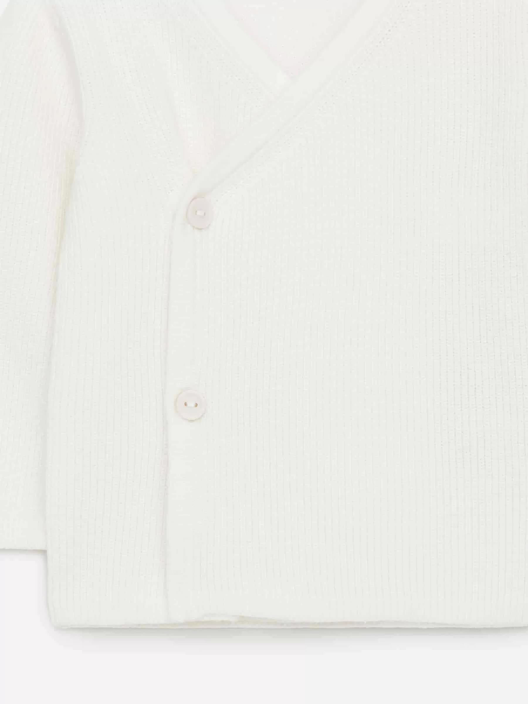 Wickel-Cardigan für das Neugeborene. Hergestellt aus ultraweicher Baumwolle und im Halbcardigan-Stich gestrickt. Mit zwei Knöpfen vorne.
